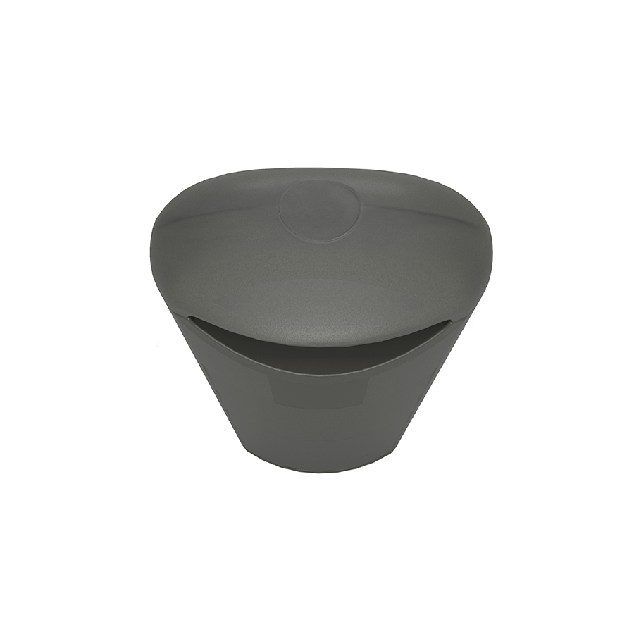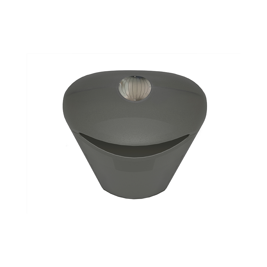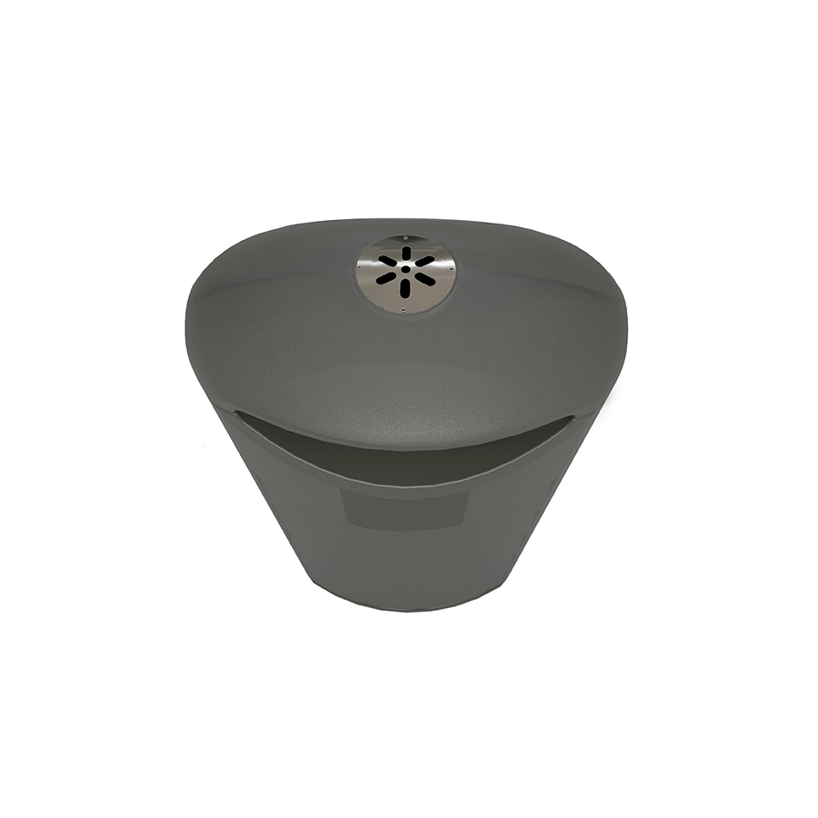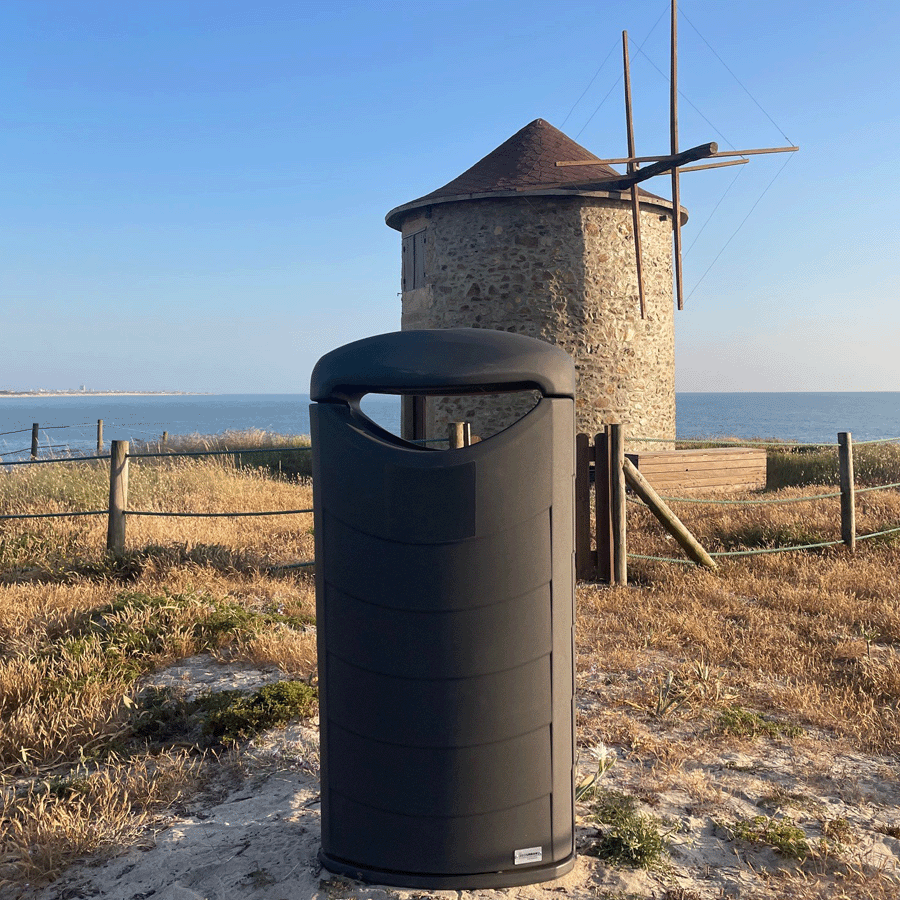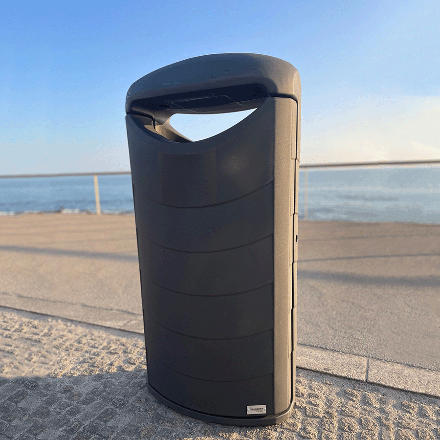 Modelo de papeleira robusta e resistente a condições ambientais adversas. Possui duas aberturas em faces opostas para o depósito de resíduos e uma porta frontal protegida por uma fechadura com sistema de autoconsumo. Oferece a possibilidade de personalização nas faces frontal e traseira. Sistemas de recolha: aro interior ou balde metálico interior, com banda elástica para garantir a fixação do saco.