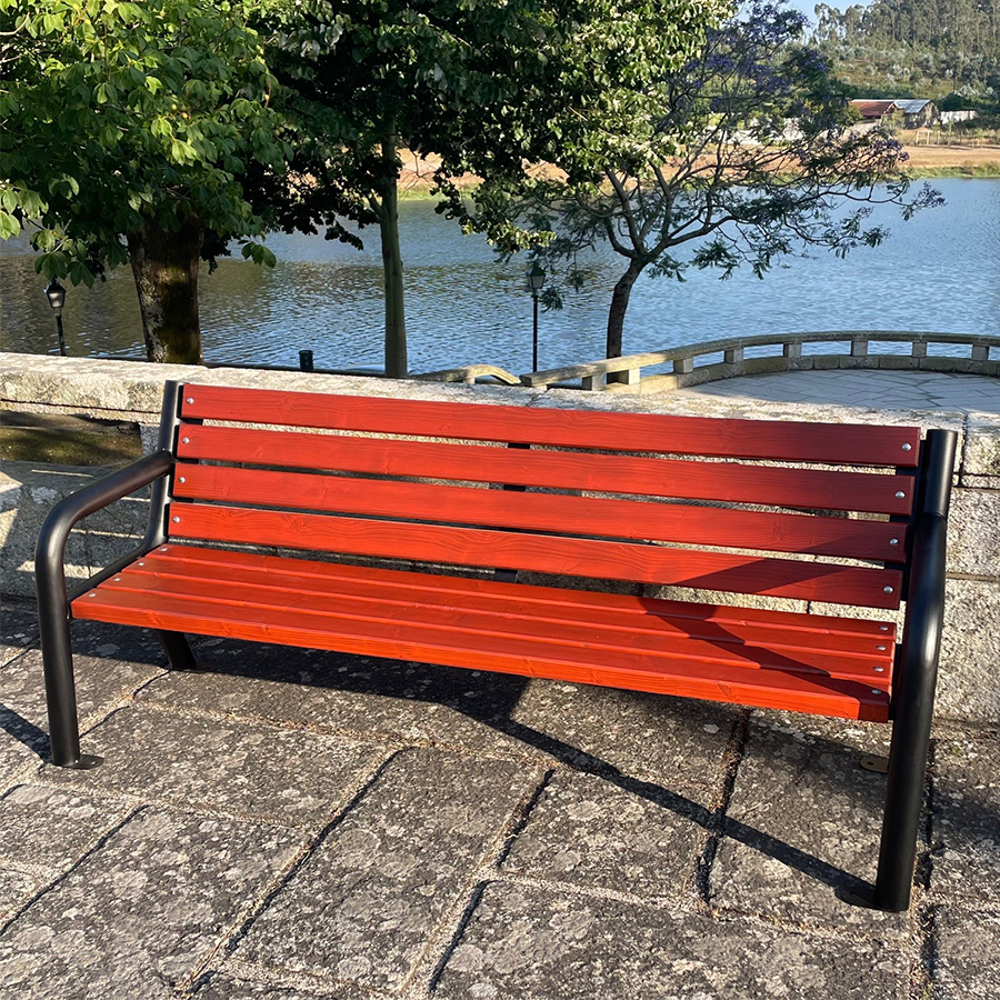 Modelo de banco fabricado em aço, com ripas de madeira tropical, protegidas com verniz à base de água.