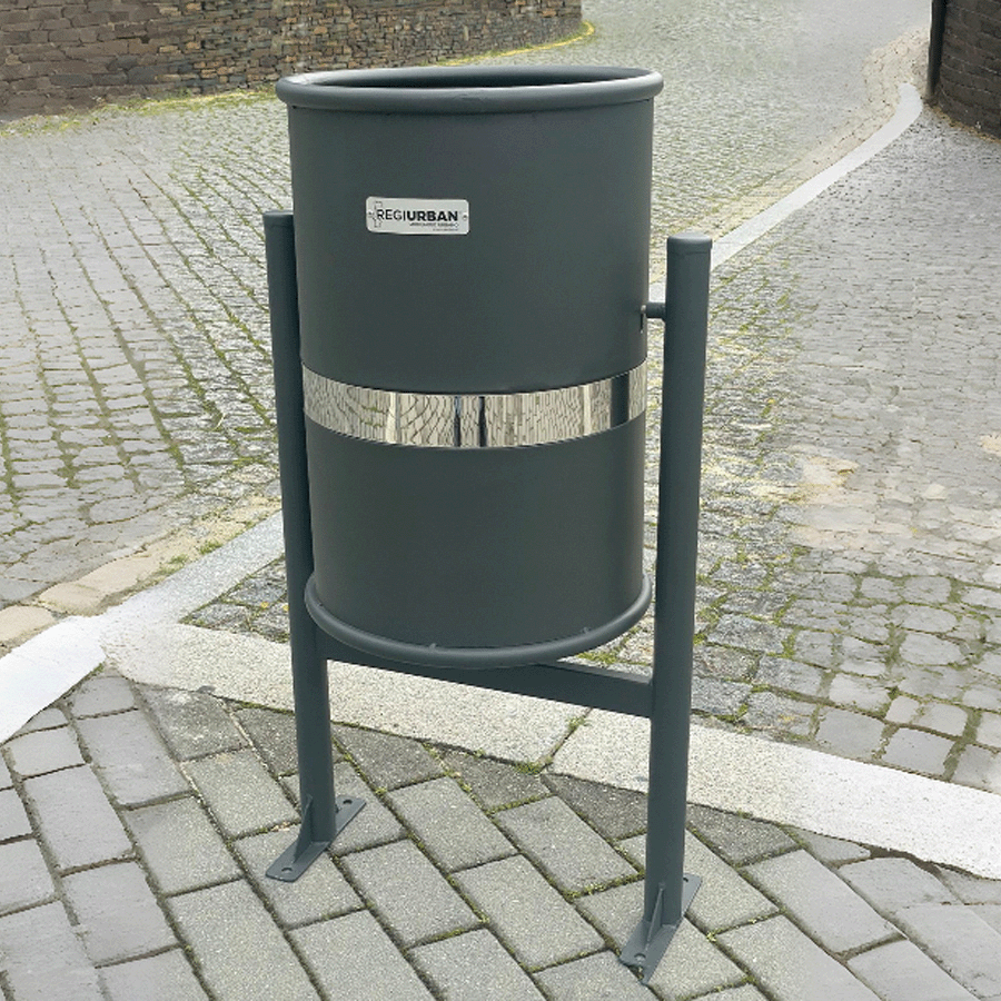 Modelo de papeleira urbana com sistema abatível para facilitar o esvaziamento e sistema de bloqueio. Equipada com anel superior em aço inoxidável.
